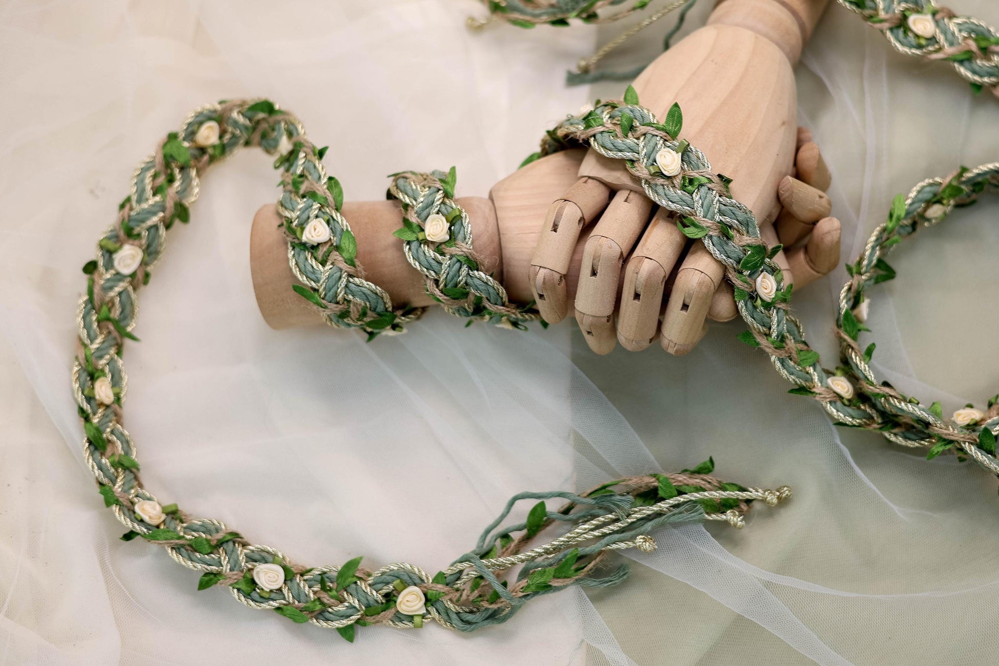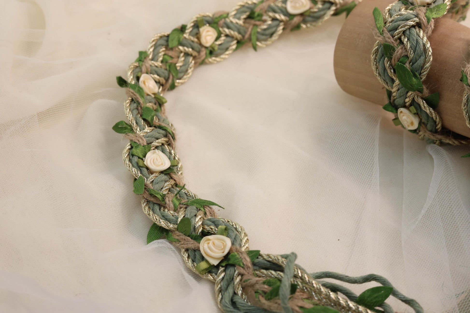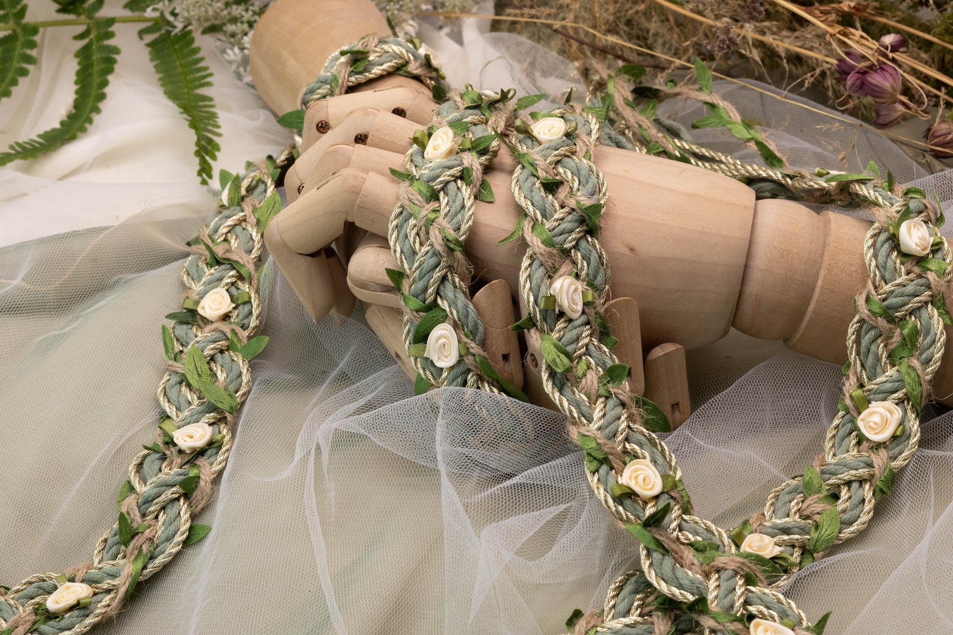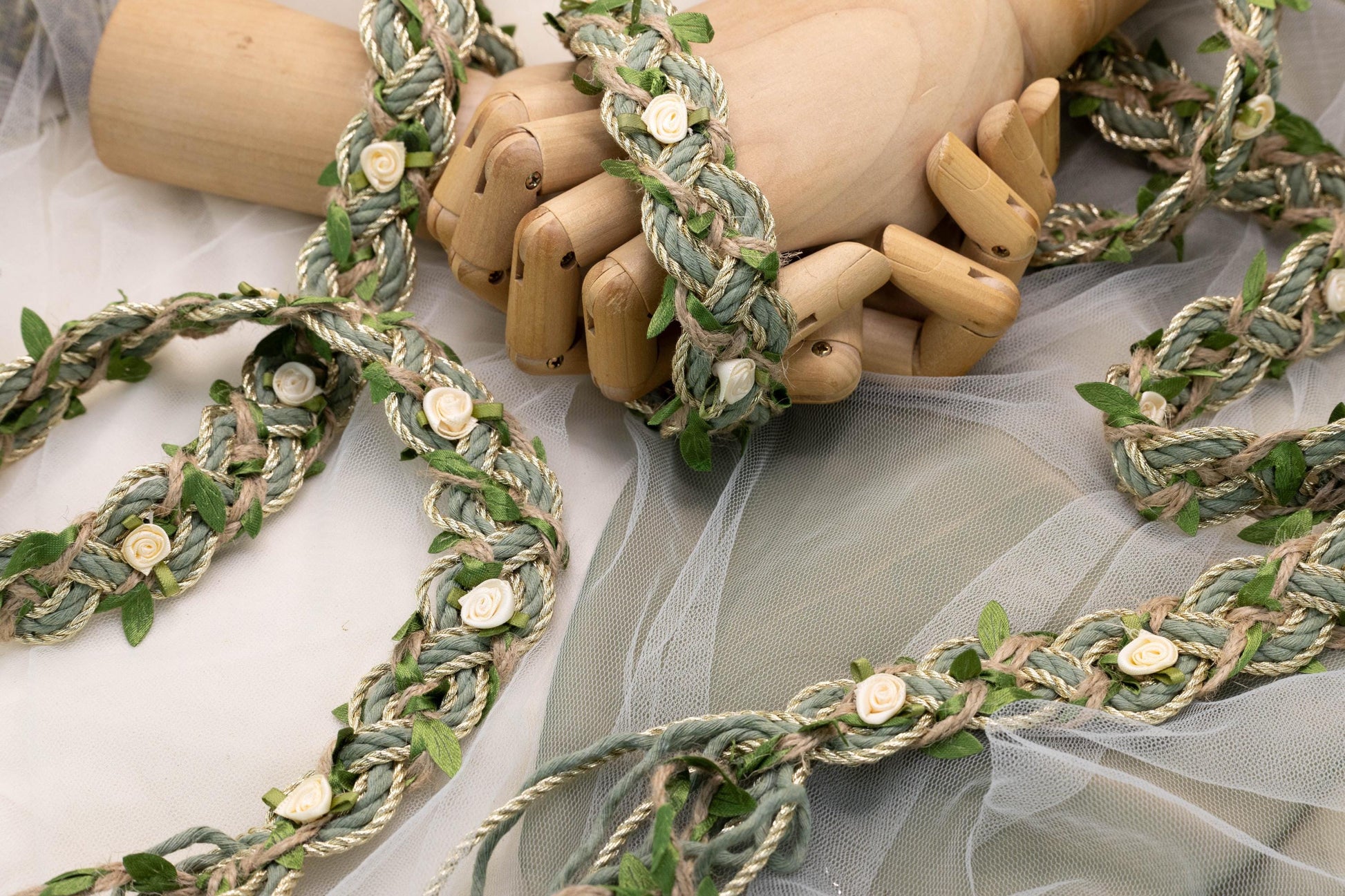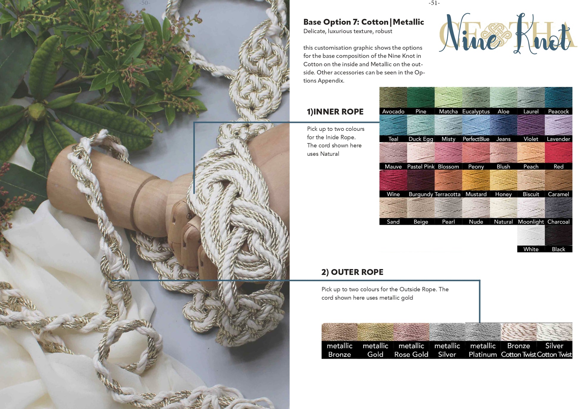 This cord uses: cotton inner (eucalyptus) and a metallic gold outer with cream roses (can be customised)