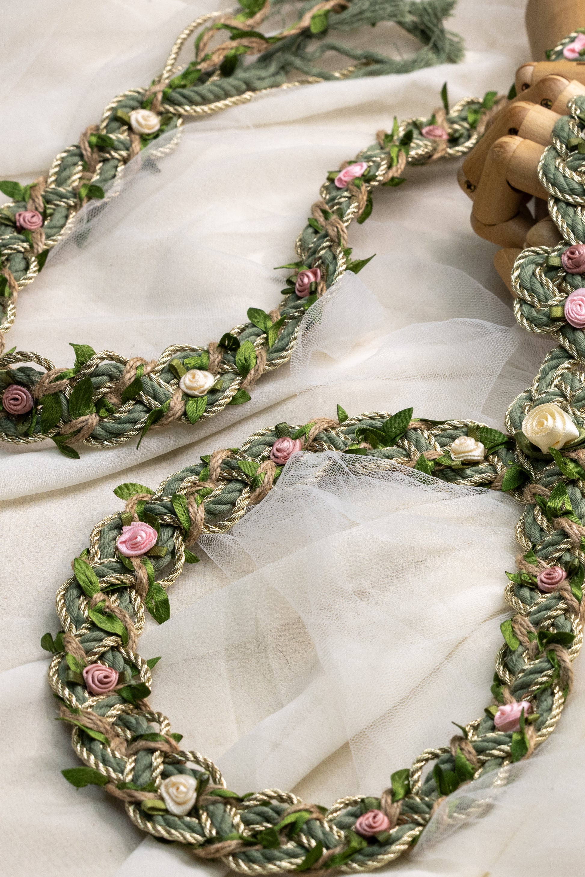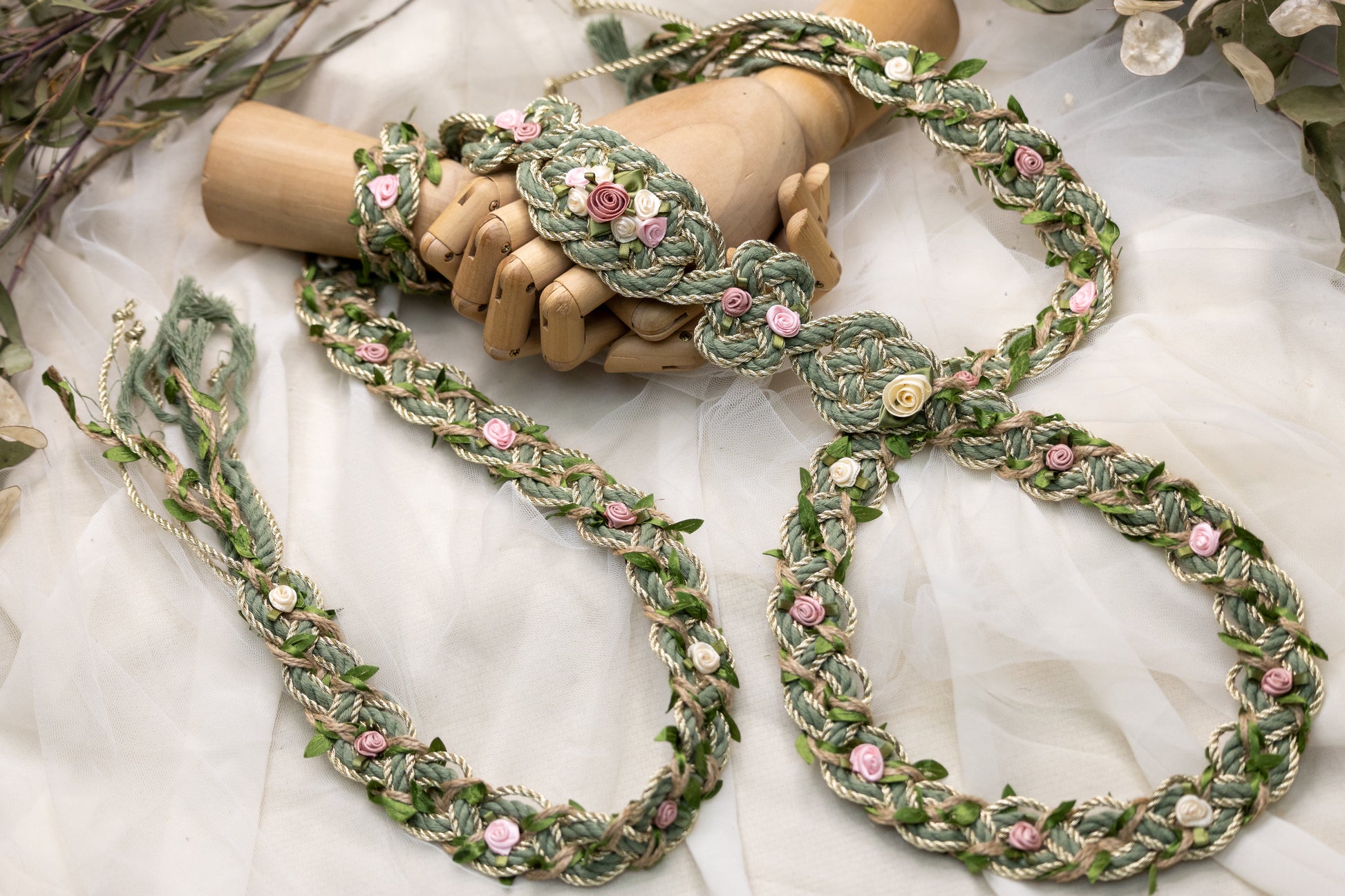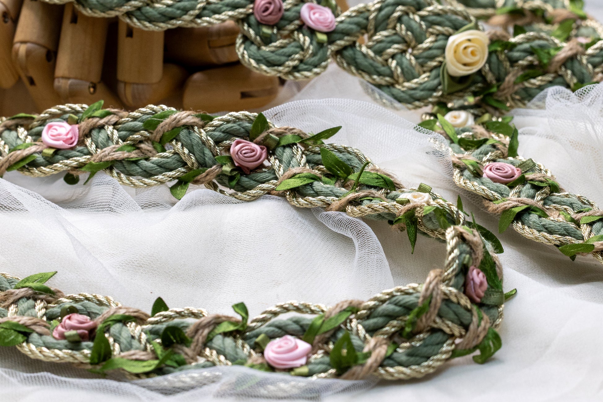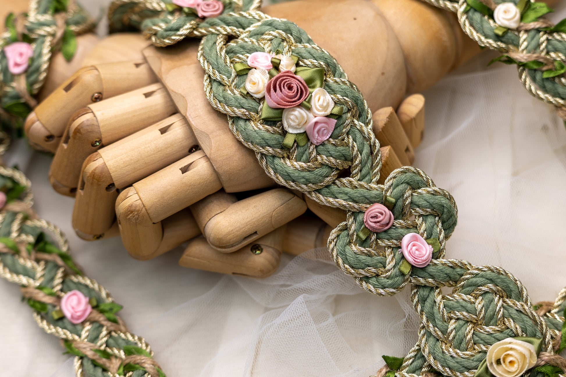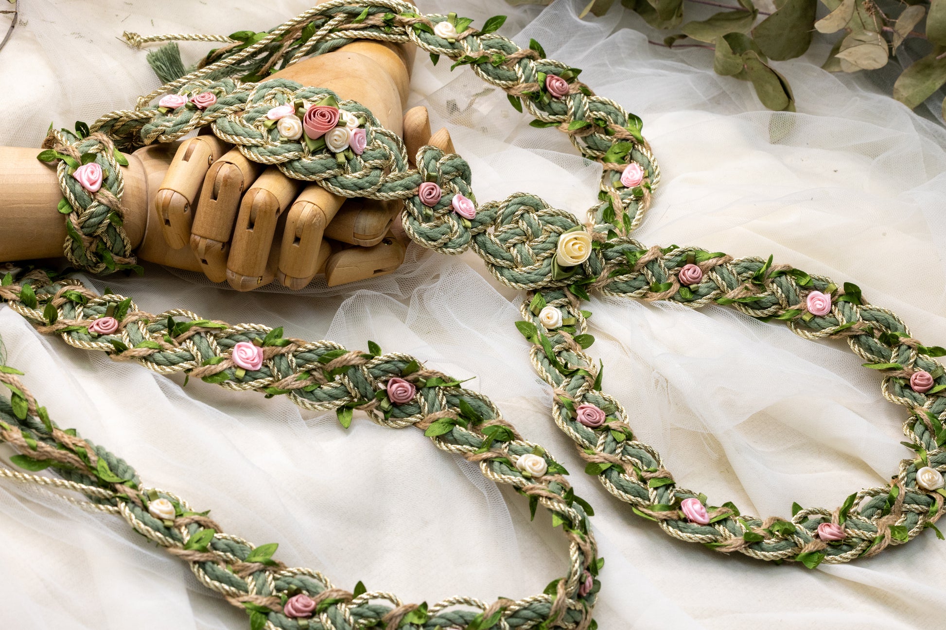 Inspired by the fairy folk of the Celtic isles, this artisanal handfasting cord features roses on five Celtic love knots and a Celtic weave.