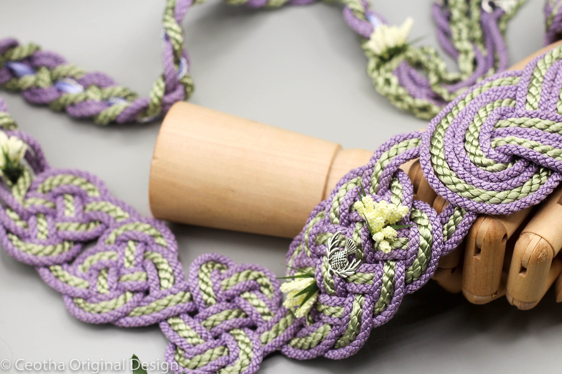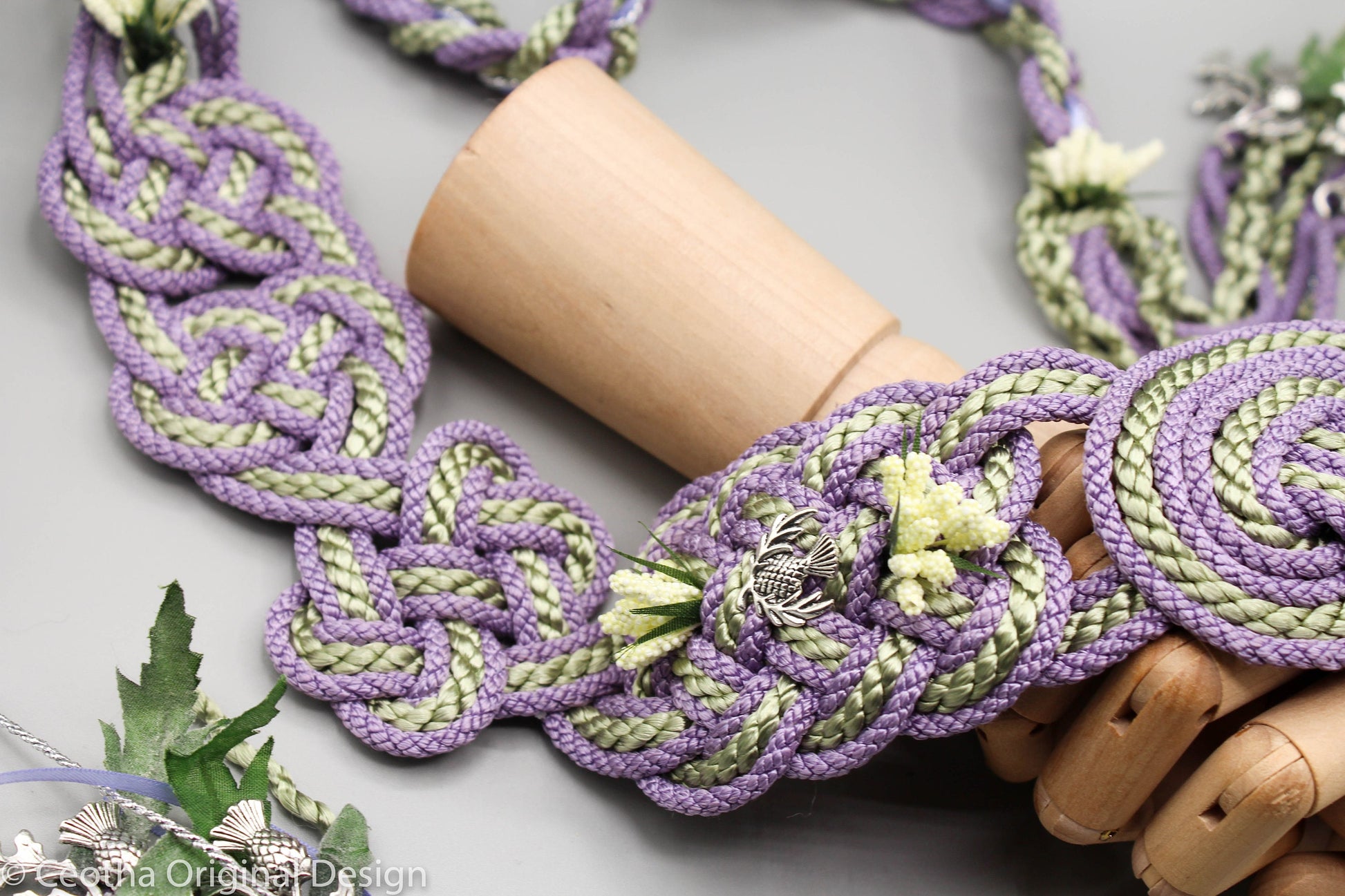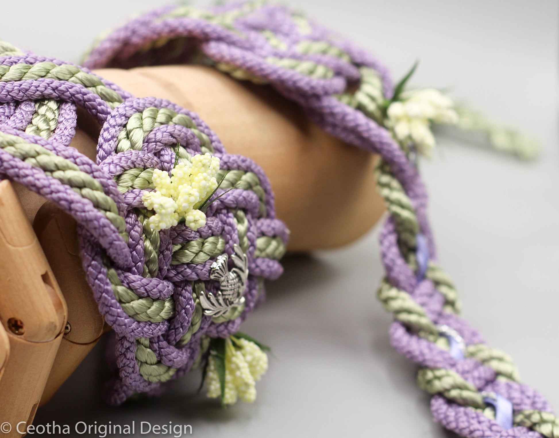 The cord shown here is made from a Satin Viscose base. Additionally, this listing comes with two accents, added florals across the cord and Thistle leaves on the ends.