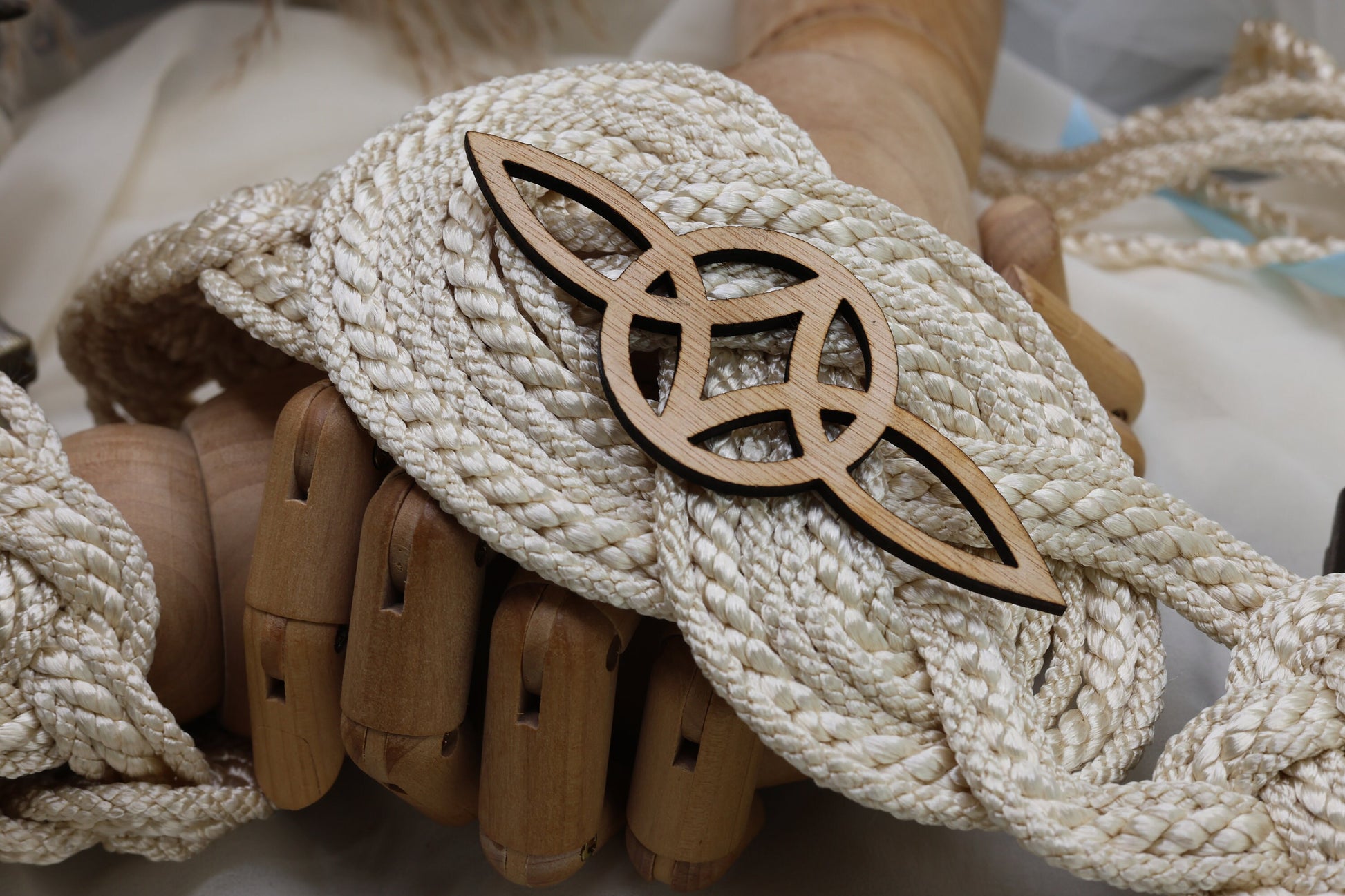 This cord features a wooden Serch Bythol, a Celtic Symbol of eternal love on its center knot. It is made from a Satin Viscose base. This configuration also includes a satin ribbon accent through the braids.