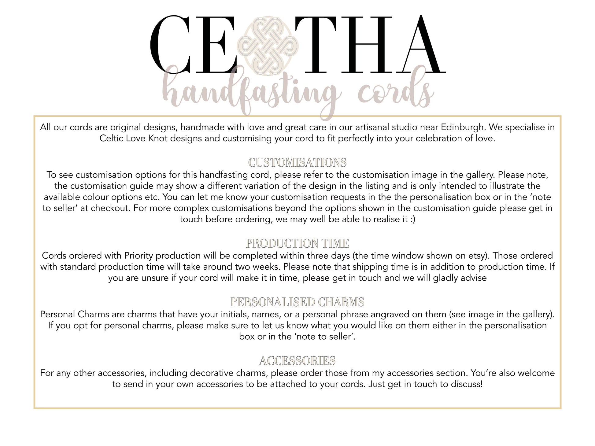 All our cords are made with great love and great care by Scottish Artisan Ceotha and her small team to create the perfect keepsake and accessory for your special ceremony. We make each order from scratch and making sure the cords we make are the perfect fit for your ceremony is our highest priority.