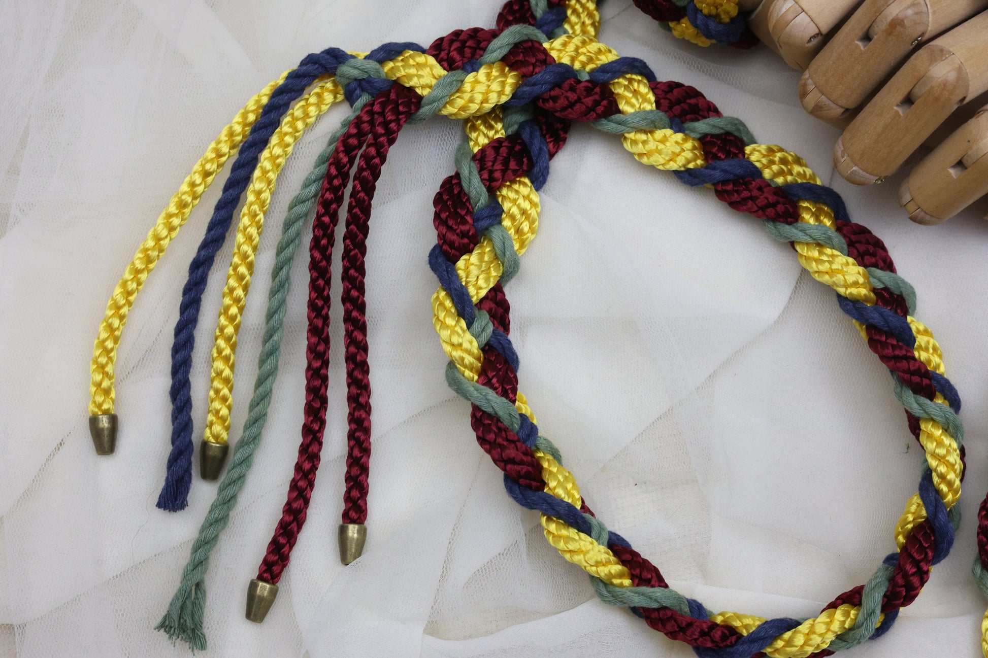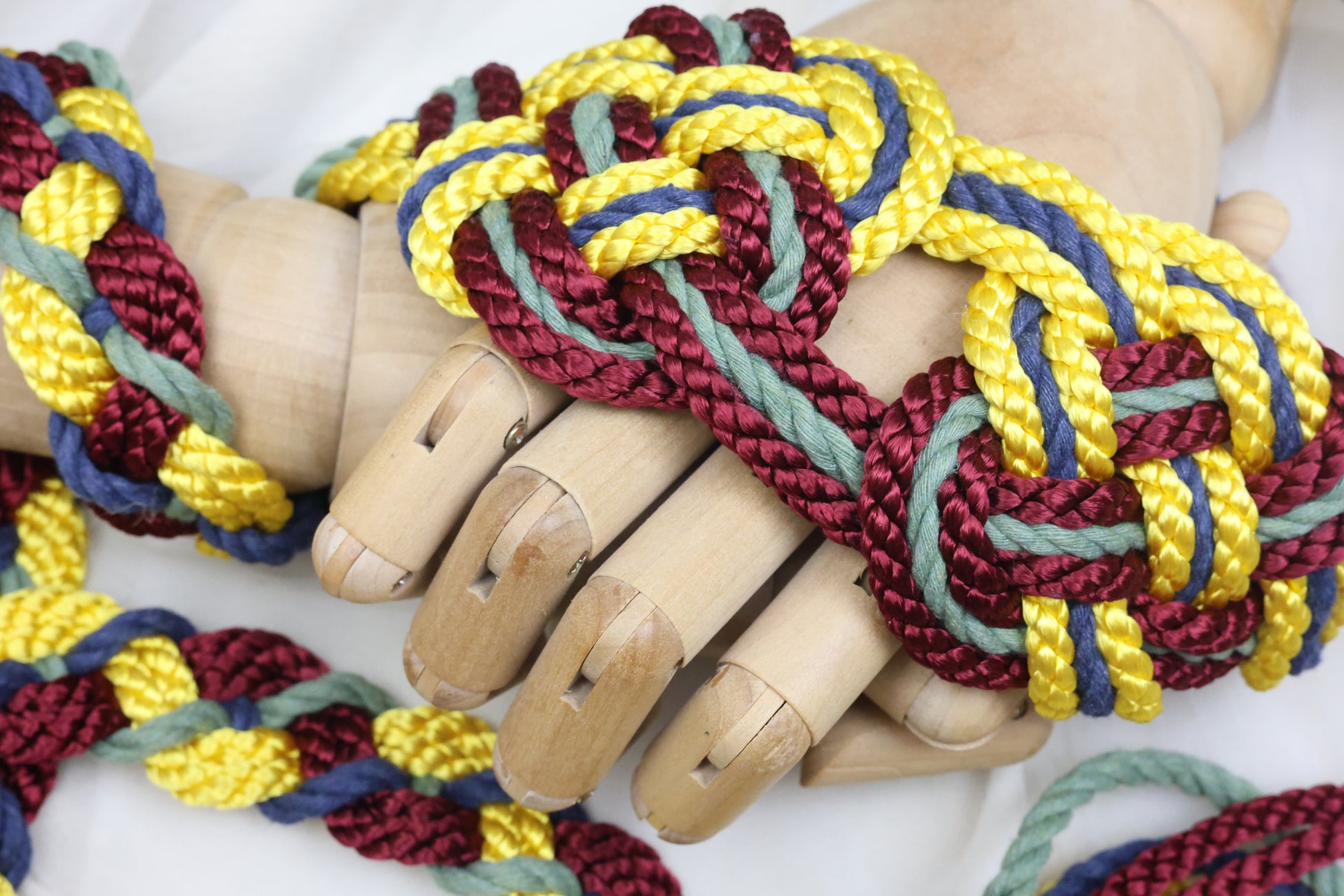 This design uses a mix of our Viscose and Cotton range of cord. The inner cords are Jeans and Eucalyptus, the outer cords are Yellow and Burgundy. This design also features Bronze end caps.